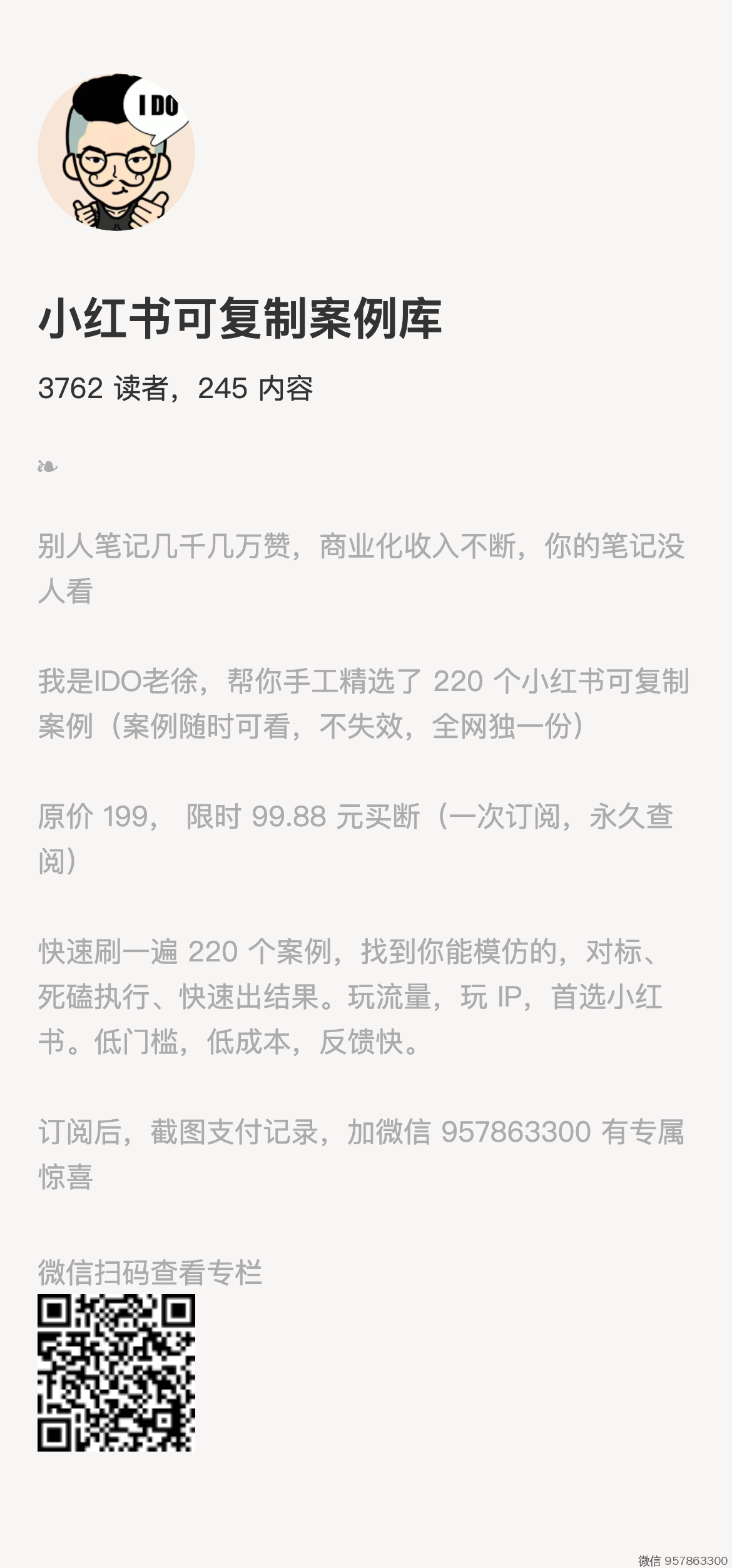 基于这个痛点,老徐花了几个月时间,找了 220 个小红书可复制案例,99.88 / 人,已经近 4000 人付费订阅。从数据来看,有价值,带出了很多小红书博主 ,